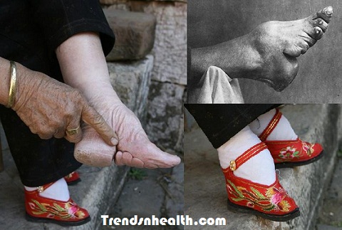 In a bizarre tradition in China, the foot of a young girl of 4-5 years isΒ bindedΒ to prevent the growing of the foot. The girl withΒ bindedΒ foot cannot walk, run, work or jump. The tradition is not forΒ anyΒ omen, religious value or to stay away from evils. This tradition is a sign of beauty and sensuality, it was believed that small foot makes a girl look more beautiful.